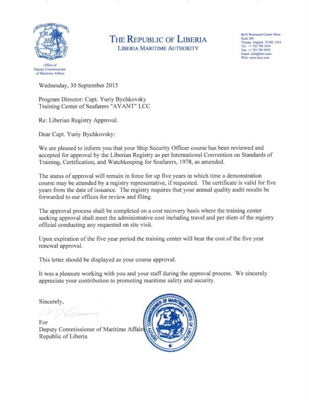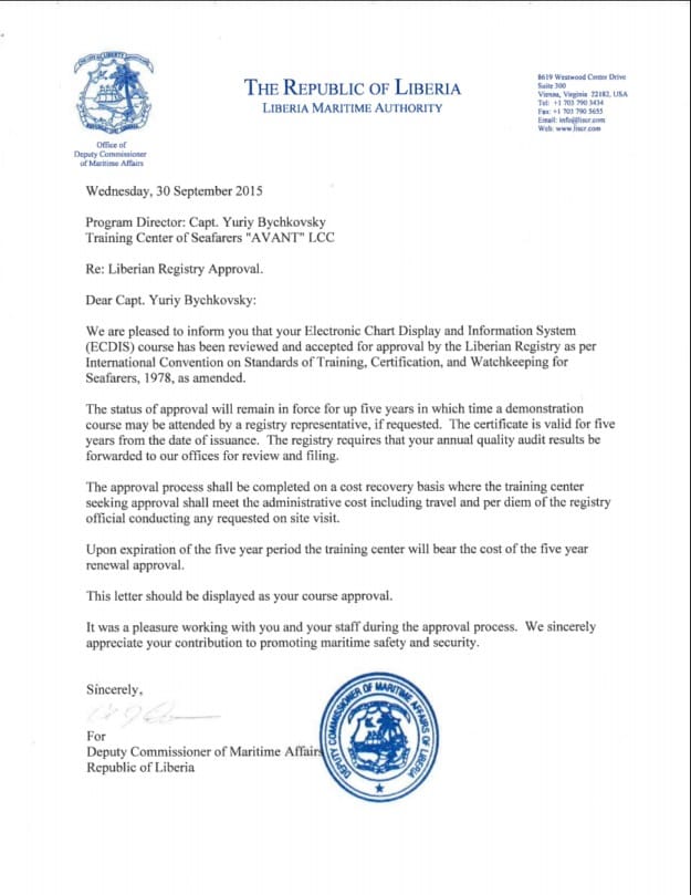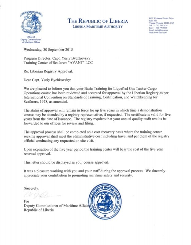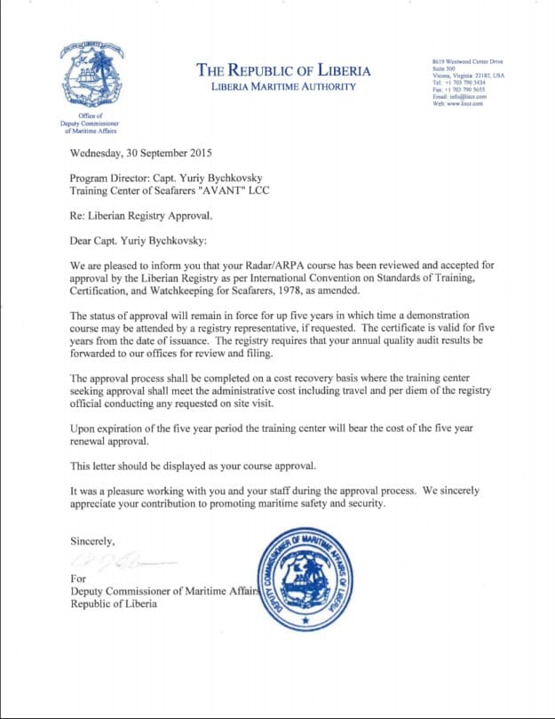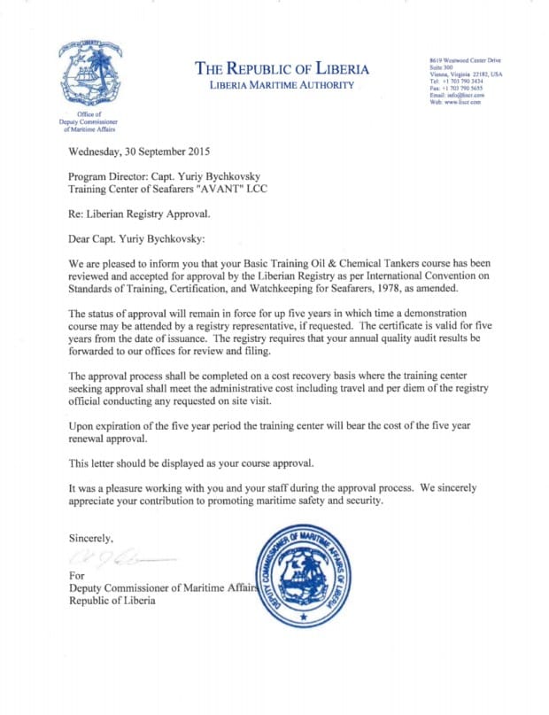 On September 30, 2015 -16 AVANT’s maritime training programs, simulator’s training, facilities and educational management system were approved and certified by the Liberian Maritime Authority the Republic of Liberia.